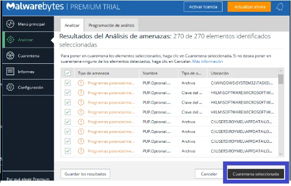 6- Cuando el análisis haya finalizado, se le mostrará una pantalla que le mostrará las infecciones de malware que Malwarebytes Anti-Malware ha detectado. Para eliminar los programas maliciosos que Malwarebytes Anti-malware ha encontrado, haga clic en el botón “Cuarentena Seleccionada”.
