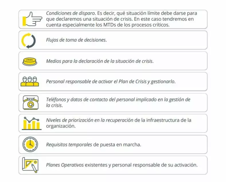 La Planificación del proceso correo a cargo de la implantación de las iniciativas. En esta fase elaboraremos un Plan de Crisis para evitar que se tomen decisiones incorrectas. Como veremos en la imagen, este plan recoge todos los elementos necesarios para una buena gestión de crisis:
