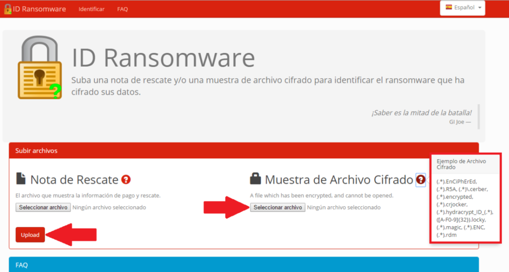Para identificar con más precisión el tipo de ransomware, puedes recurrir a herramientas de análisis como ID Ransomware. Desarrollada por MalwareHunterTeam, esta plataforma permite subir un archivo cifrado y la nota de rescate para su análisis. ID Ransomware puede identificar más de 800 variantes de ransomware y proporcionar detalles sobre las posibles soluciones de descifrado.